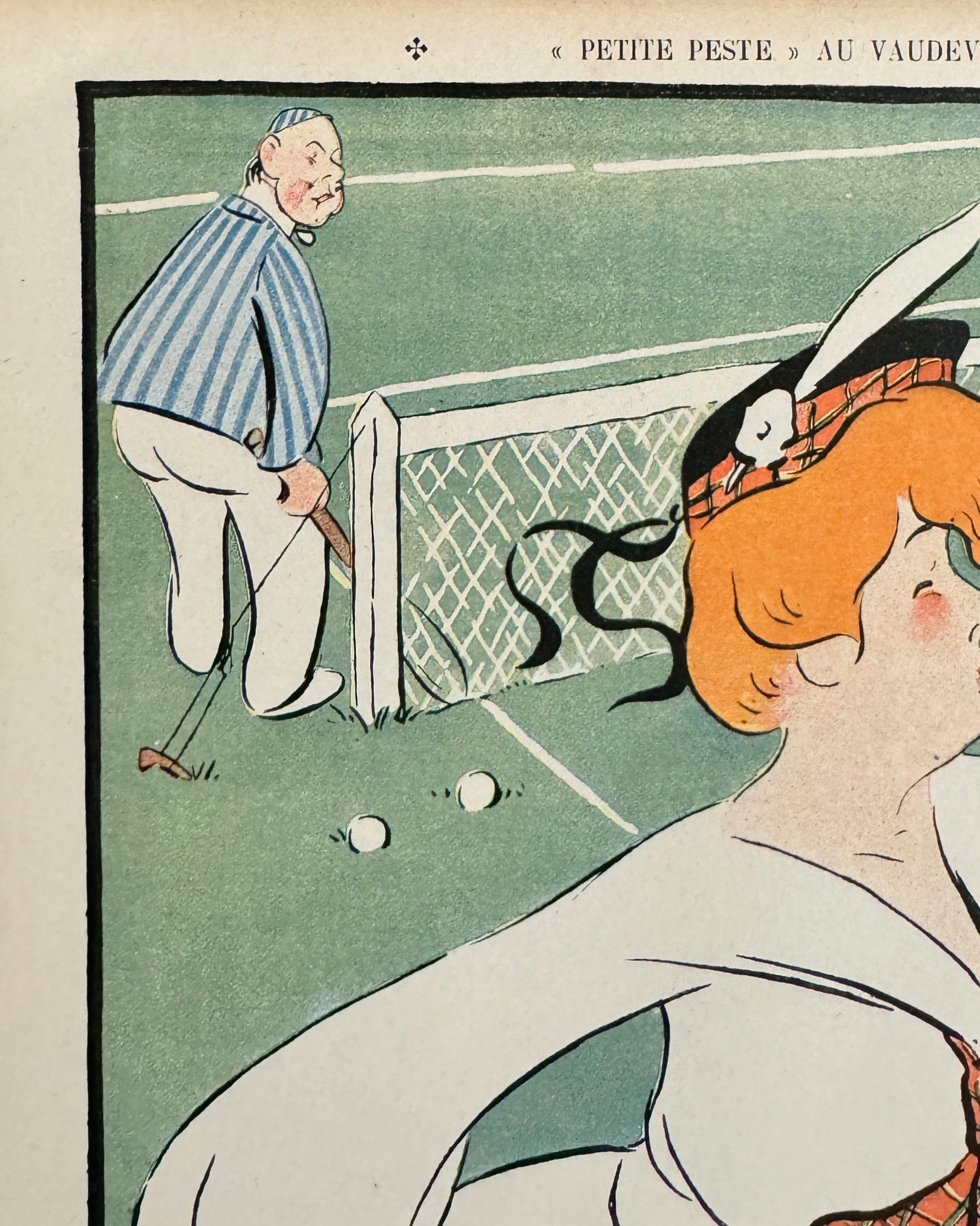 EXCLUSIVE AT LE ALFRÉ. This is a vintage De Losques 1905 Marthe Régnier caricature print. A rare, authentic piece from the past that adds character and history to any setting.
